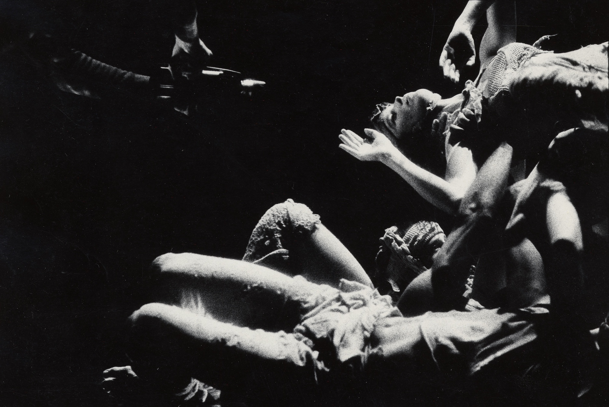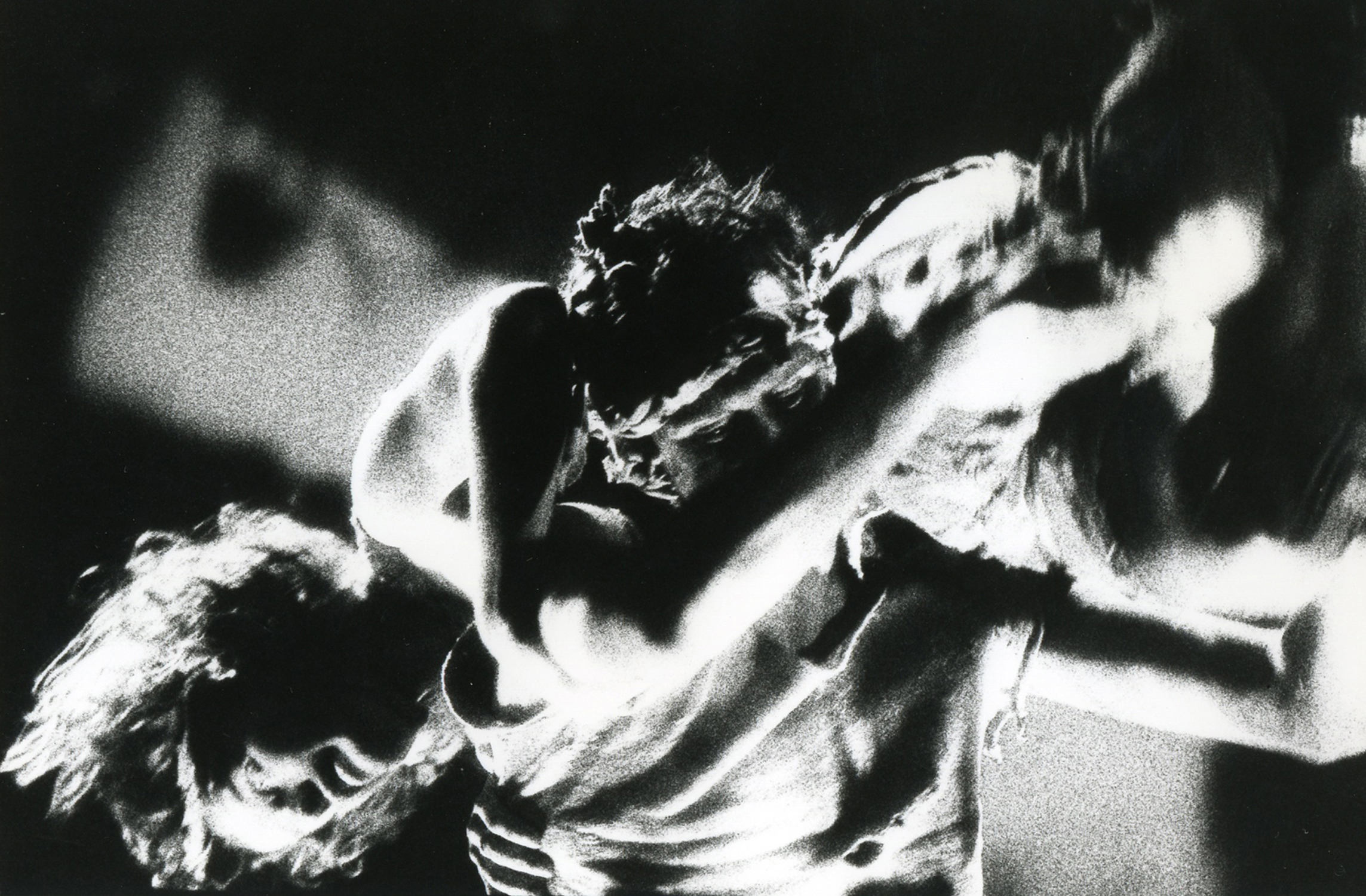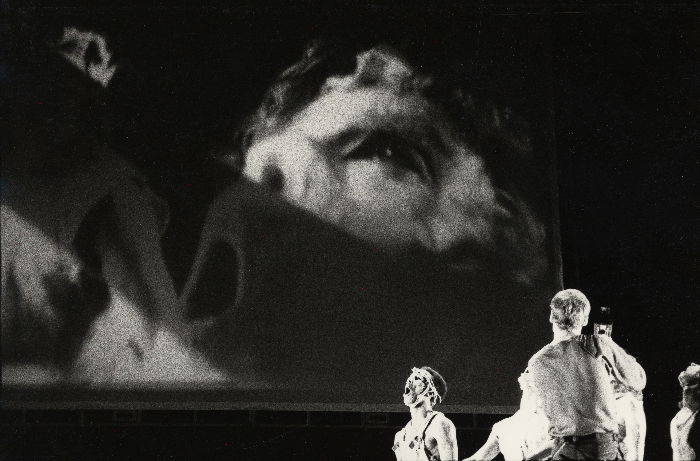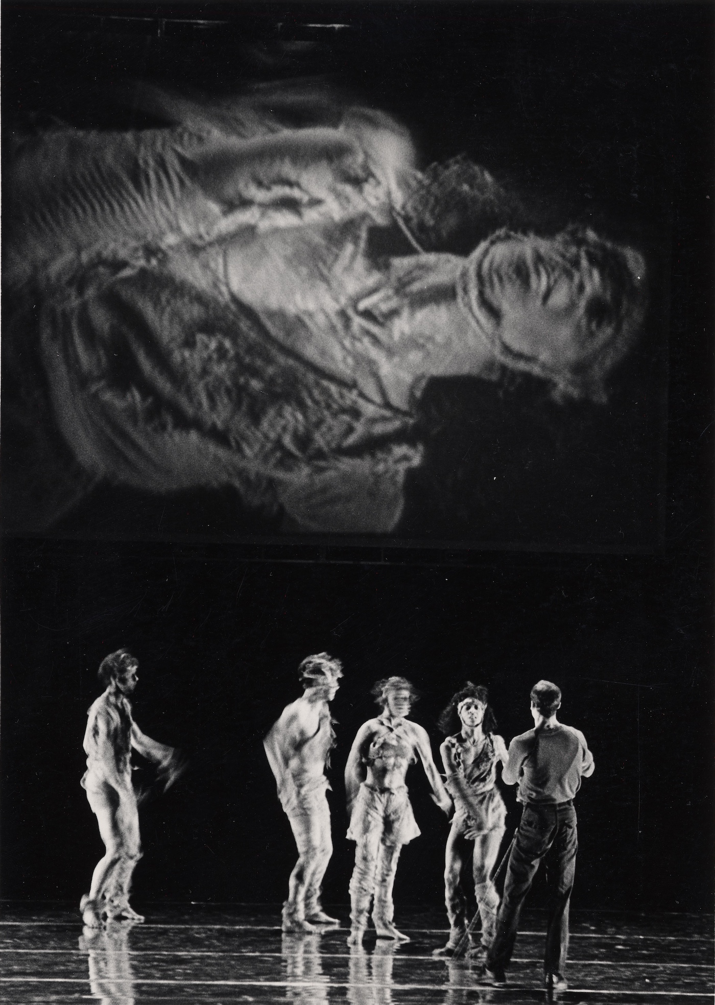 A camera operator moves onstage amongst the dancers in Bad Smells, the live video feed projected on the back wall. Extreme close-ups, inverted images and jolting camera movements create a warped reiteration of the thrashing choreography. The floor, covered in silver mylar, twists the dancers’ reflections, adding another layer of distortion to the projected image. It is in this skewed environment that the dancers perform a final act of ritual sacrifice.