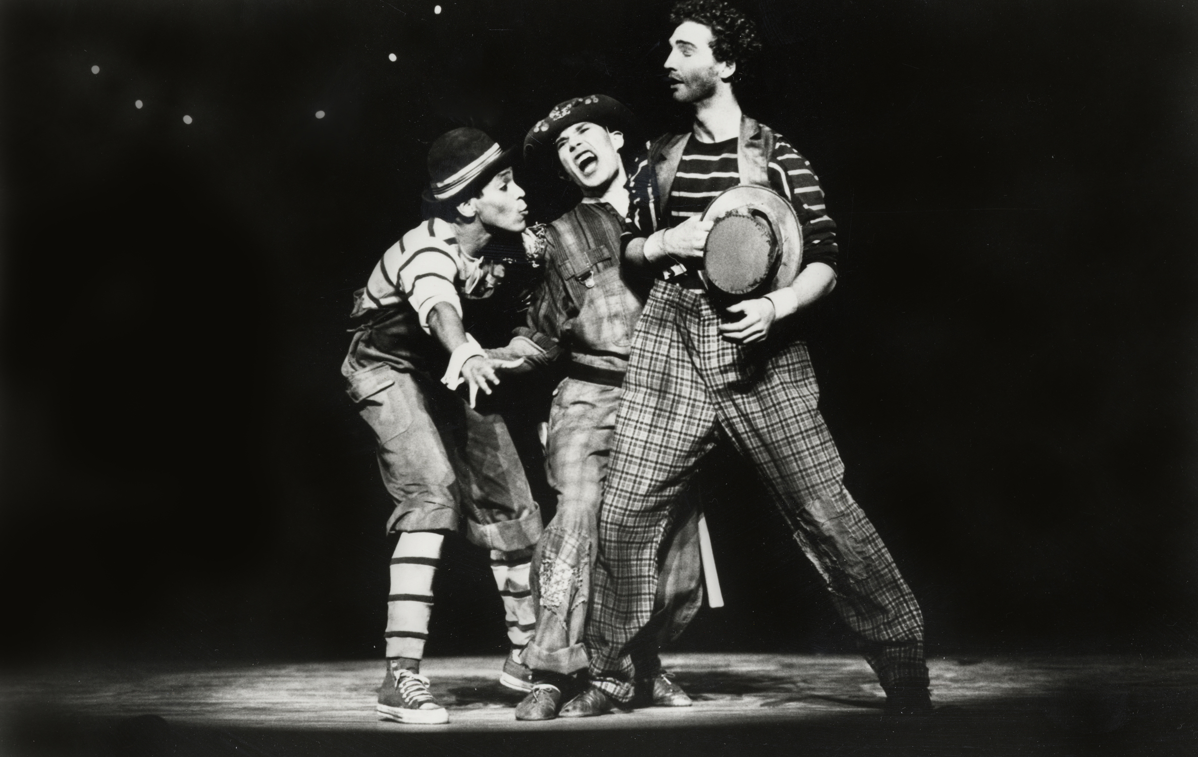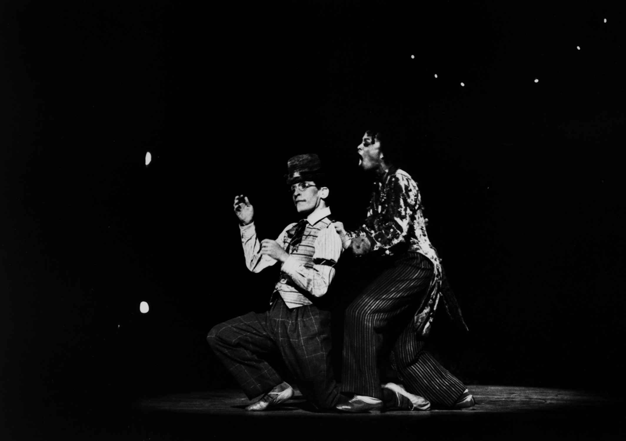 Bum’s Rush is an absurdist ballet structured as a vaudeville show. The piece opens with a man standing alone on a bare stage. As the light comes up, he doubles over in a fit of hysterical laughter. A trio of tramps enters, interspersing their dance with bawdy jokes; a man in squeaking sneakers provides the soundtrack for a duet.