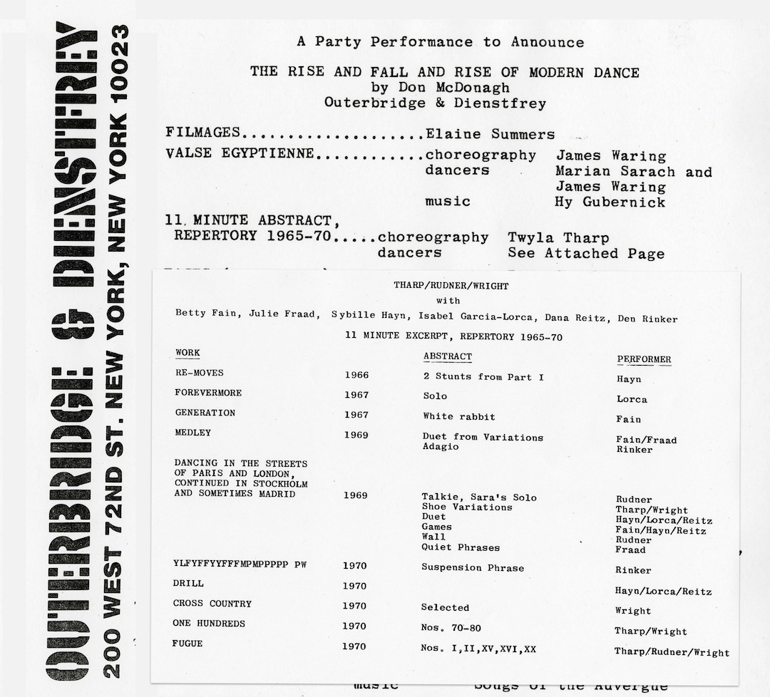 The original program stated: “A Party Performance to Announce ‘The Rise and Fall and Rise of Modern Dance’ by Don McDonagh, Outerbridge & Dienstfrey”. The “party performance” also included works by Elaine Summers, James Waring, David Gordon, John Herbert McDowell, Judith Dunn, Rudy Perez, David Vaughan and Al Carmines.