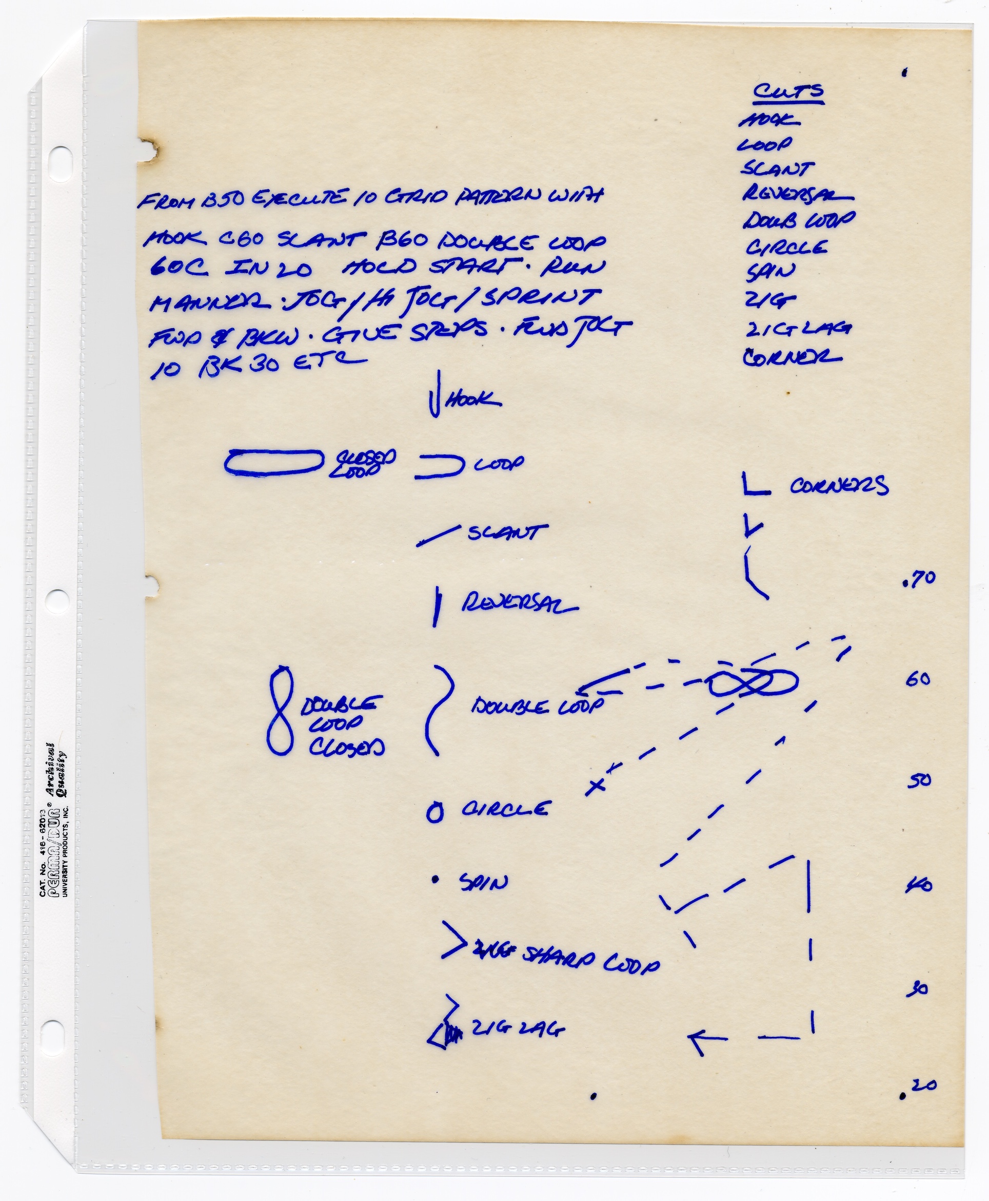 Original choreographic notes from Drill (1970), created for the New England Patriots and performed in Eleven Minute Abstract (1970).