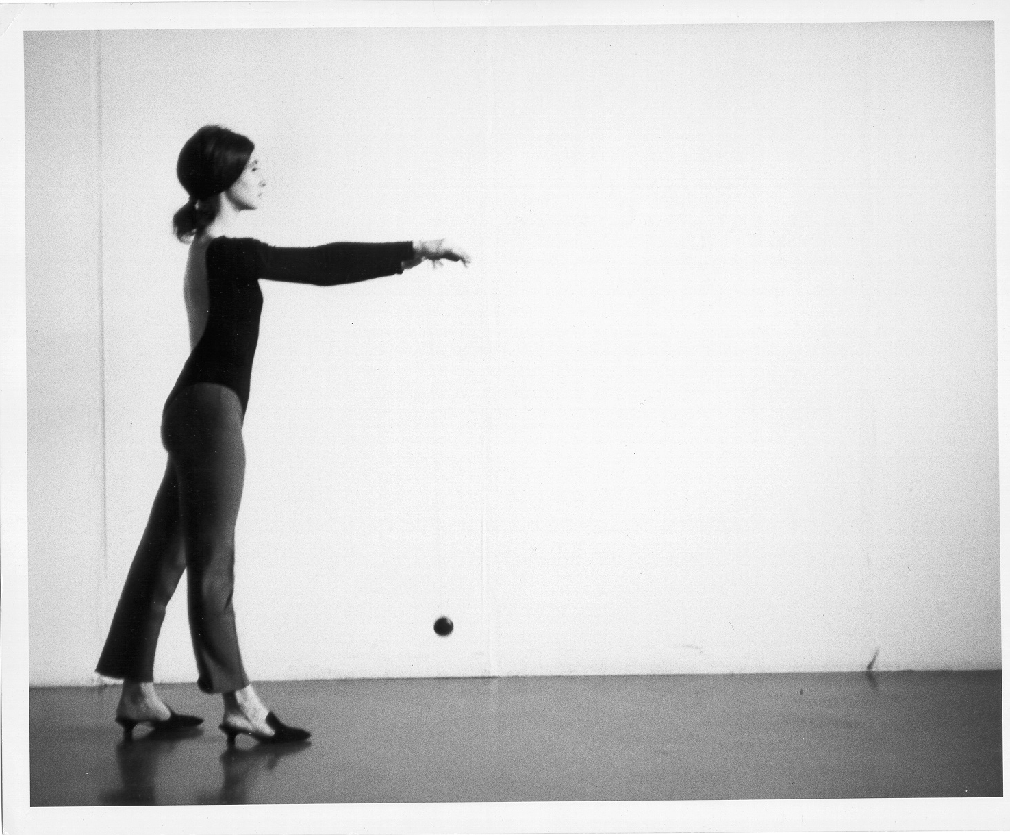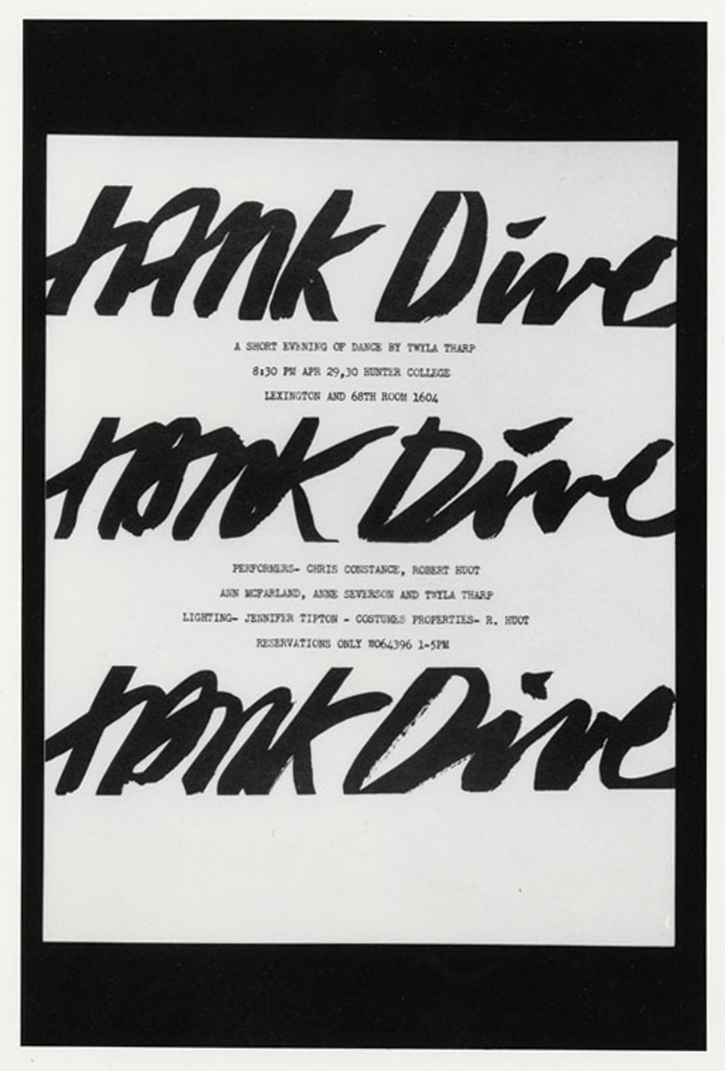 Tank Dive begins as Tharp enters a darkened room wearing a pair of heeled shoes. She stands in parallel fourth position and spins a yo-yo representing the earth. The pop hit “Downtown” plays in the background as a tongue-in-cheek statement about the location of the New York underground arts scene and its rebellion against popular culture. Tharp counterbalances in a flat-back position against the weight of a second pair of shoes, a direct reference to the Egyptian goddess Nut. The title Tank Dive reflects Tharp’s belief that becoming a successful choreographer is equivalent to the chances of successfully diving into a thimbleful of water from a great height. These specially designed, oversized wooden shoes also serve as counter-weight to her exaggerated diver’s poses.