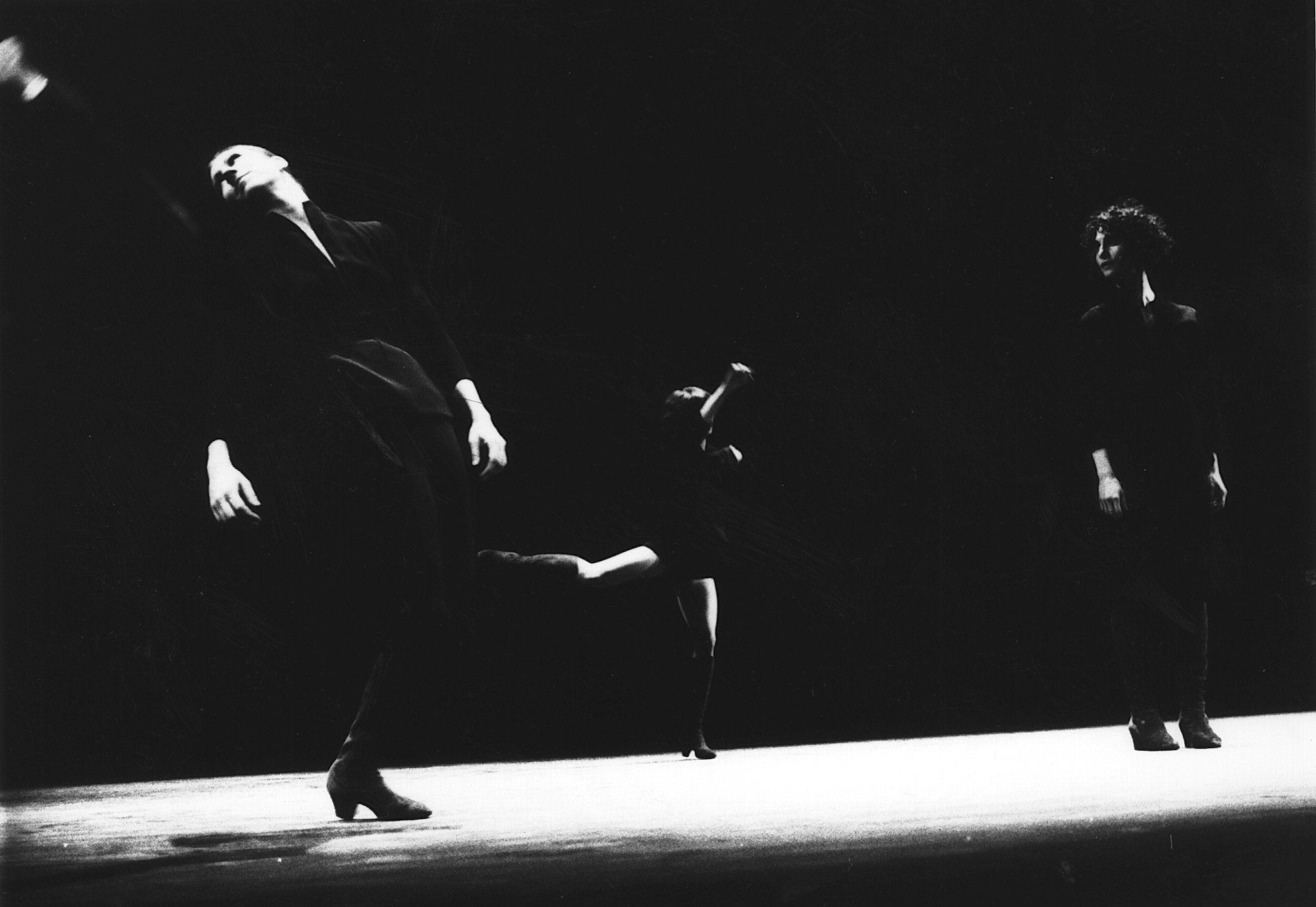 Modeled on The Musical Offering by Johann Sebastian Bach, The Fugue consists of a twenty-count theme which is developed into twenty variations. The theme is modified through a number of reversals, inversions, retrogrades and repetitions, re-sequencing and rhythmic manipulations. Each of the three dancers represents a musical register: bass, alto, soprano. The only sound is the dancers’ footfalls on an amplified stage.